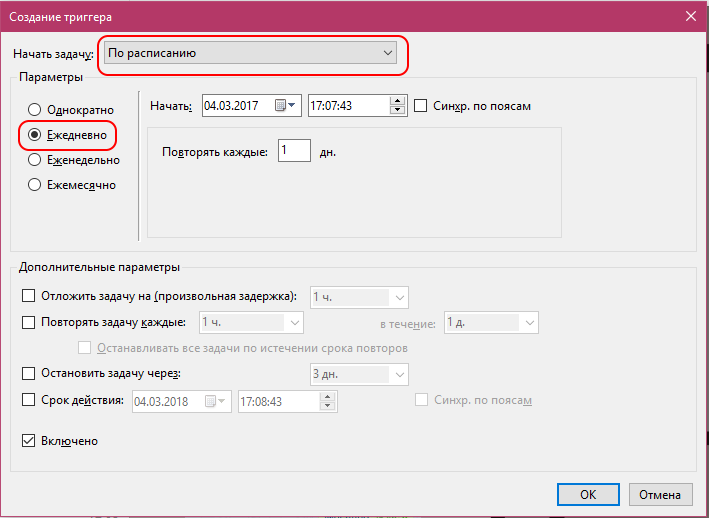 Затем переходим во вкладку «Триггеры» и жмём «Создать». Здесь выставляем параметры «По расписанию» и «Ежедневно». Далее устанавливаем время, в которое начинать задачу. Указываем своё ночное время. После чего сохраняем настройки.