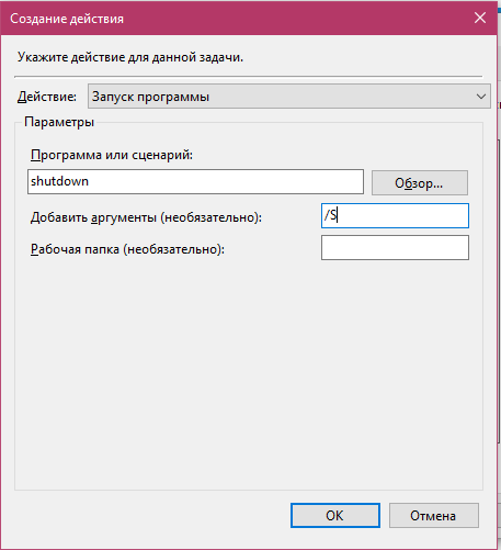 Переходим во вкладку «Действия», где жмём «Создать». Появится окно, где в графе «Программа или сценарий» необходимо указать «shutdown». Затем в «Добавить аргументы» пишем «/S» и сохраняем.