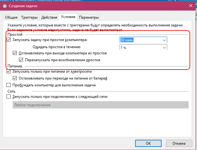Переходим ко вкладке «Условия», где в блоке «Простой» включаем все галочки и выбираем пункт «Запускать задачу при простое компьютера» каждые 30 минут.