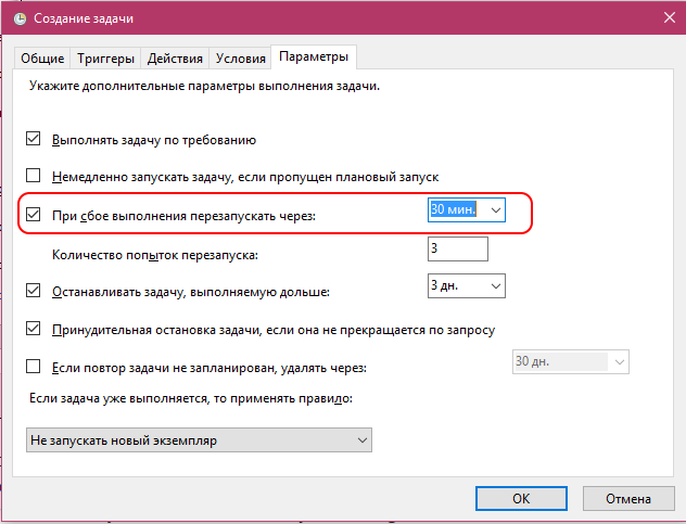 Переходим во вкладку «Параметры» и ставим галочку в пункте «При сбое выполнения перезапускать через» 30 минут.