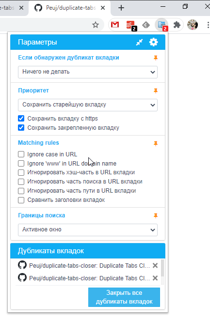 По умолчанию расширение автоматически собирает список дублей в нижней части окна, а при нажатии на кнопку «Закрыть все дубликаты вкладок» закрывает их.