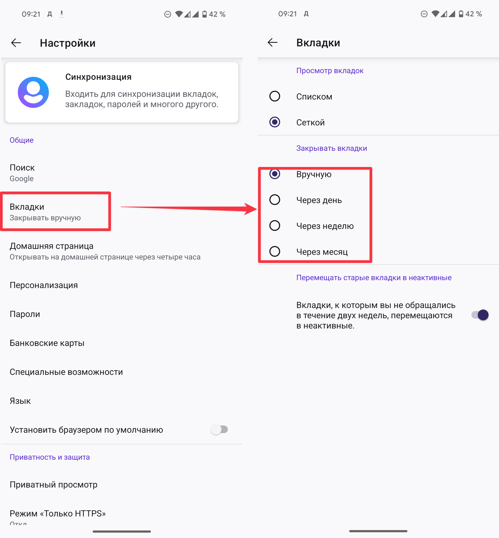 В открывшемся меню выберите раздел Вкладки и просто активируйте один из трёх вариантов автоматического закрытия: день, неделя, месяц.
