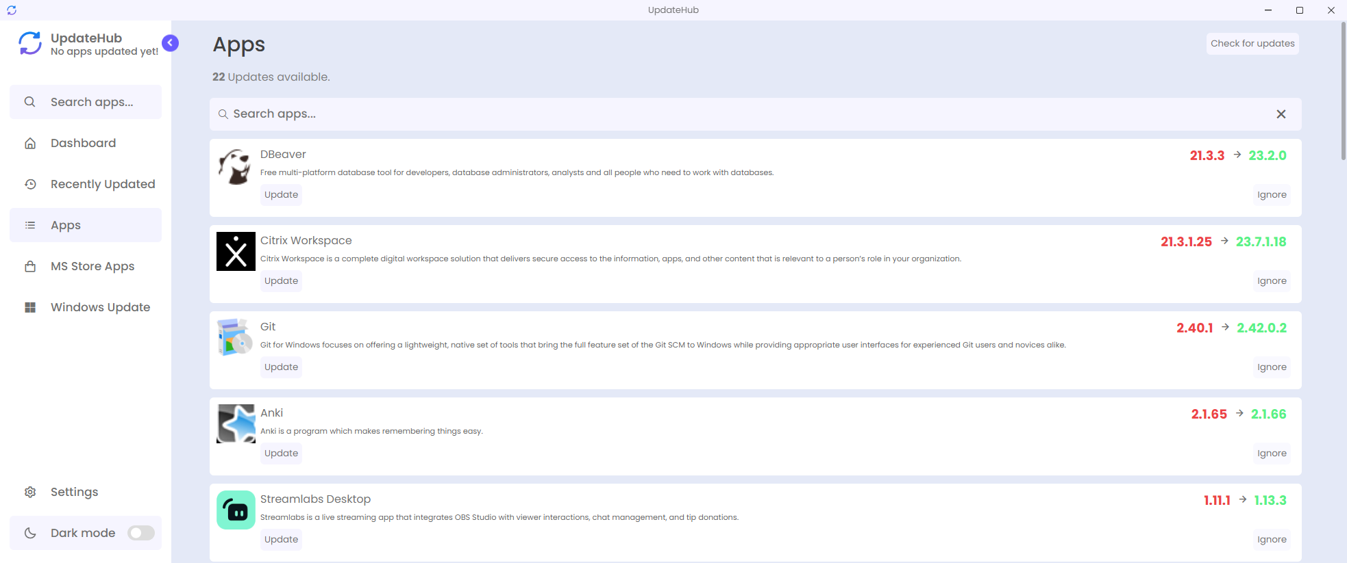 Если вы пользовались SUMO, UpdateStar и подобными утилитами, то вы можете дальше не читать. А для остальных расскажу, что UpdateHub сканирует установленные приложения, включая MS Store и Windows Updates, и позволяет автоматически обновить их.
