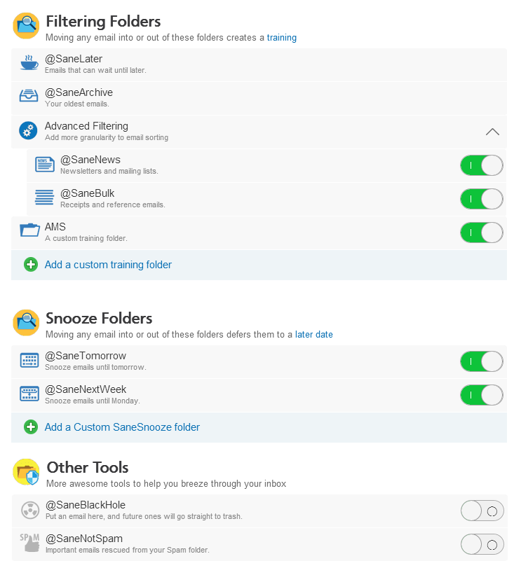 После регистрации в сервисе и завершения анализа ваших писем вы попадаете в раздел Sane Folders.