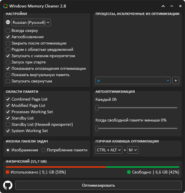 Вы можете выбрать, какую область памяти требуется очистить, какие процессы исключить. А также указать параметры автоочистки по времени или по заполнению памяти.