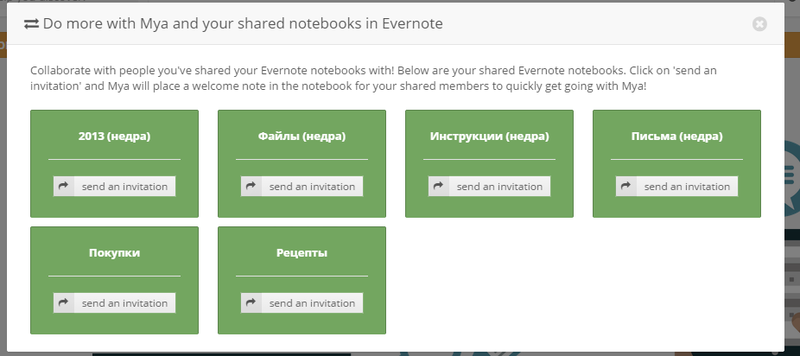 При помощи Mya вы можете открыть доступ к блокнотам Evernote вашим коллегам. После этого, когда они будут искать информацию внутри сервиса, им будут предоставлены результаты из этих блокнотов.
