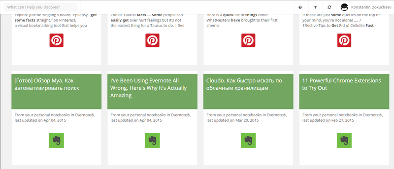 В поиске будут видны результаты из интернета и всех подключенных сервисов, в том числе Evernote. В один клик вы можете отправить необходимую вам карточку в блокнот Evernote: