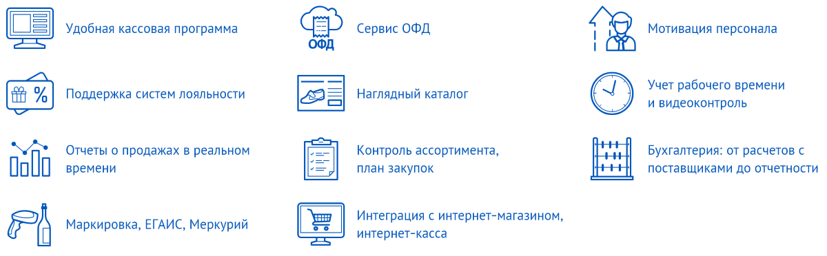 СБИС для аптек и магазинов это системы для автоматизации работы кассиров, для продажи маркированной продукции, контроля денежного баланса в кассе, автоматизации складского учёта и других функций.