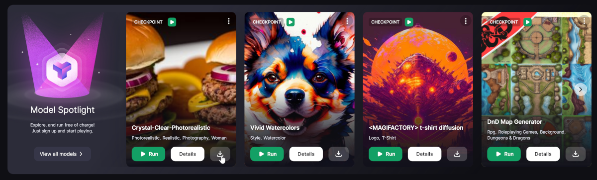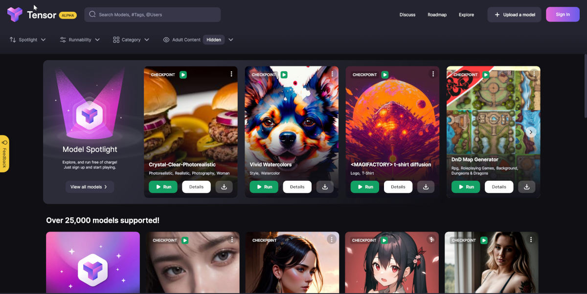 TensorPlay предоставляет бесплатный доступ к моделям Stable Diffusion Models и LoRa. Доступно более 16000 моделей с гибкими настройками и можно добавлять свои модели.