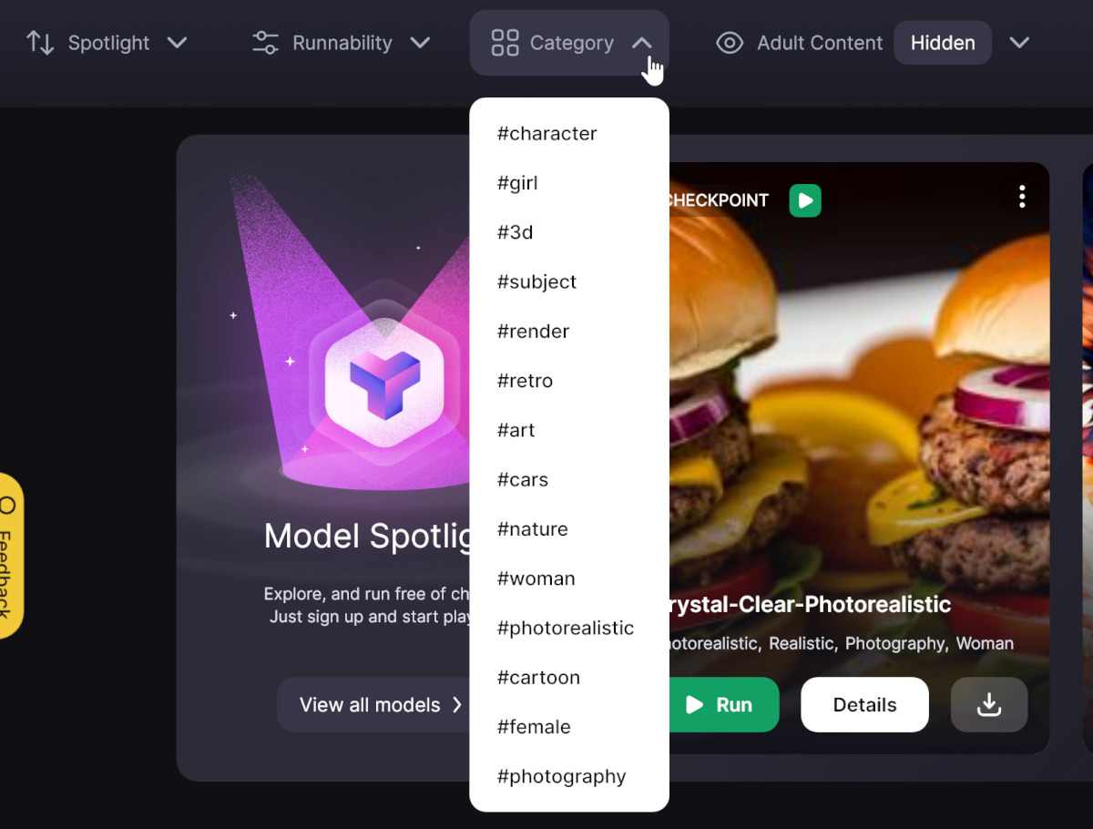 На главной странице сервиса у вас есть поиск, где можно искать по названию модели, тегу или пользователю. А ниже доступен фильтр, который дополнительно позволяет сузить результаты до типа модели (локальная или можно запустить онлайн), категории, показать или скрыть взрослый контент. Кстати, можно загружать собственные модели.