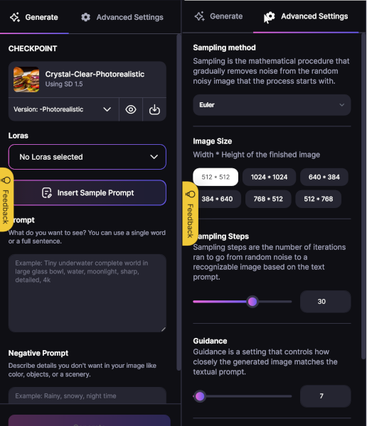 После чего вы можете задать параметры генерации изображение. Кроме самого промпта, можно применить Lora, указать негативный промпт, выбрать семплер, размер изображения, указать количество шагов и степень следования инструкциям.