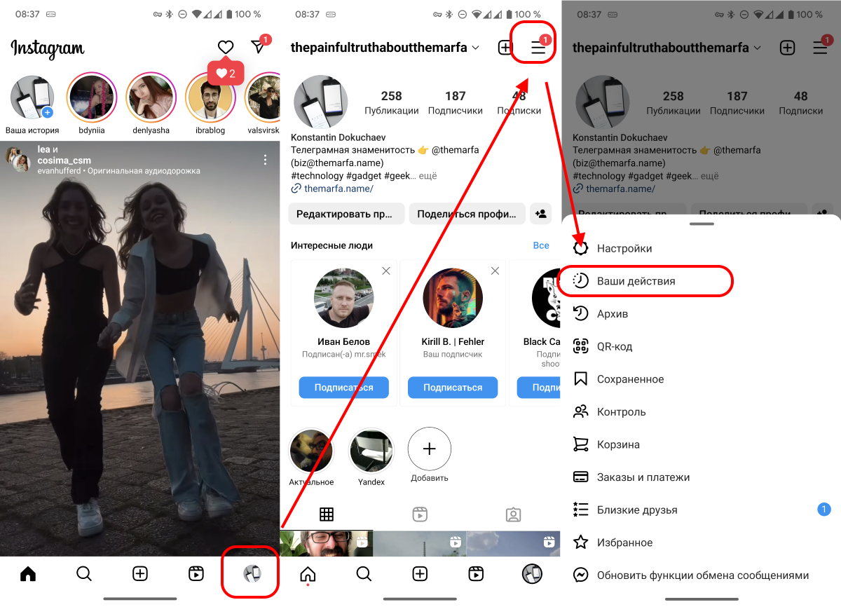 Сделать это очень просто. Перейдите на вкладку своего профиля, разверните выпадающее меню и в нём выберите пункт Ваши действия.