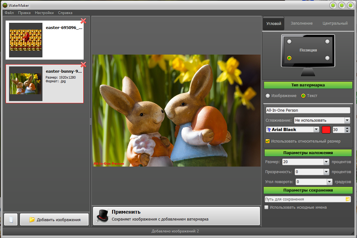 С работой в программе справится даже ребёнок. После запуска WaterMaker PRO нужно добавить фотографии и настроить параметры вашего вотермарка.