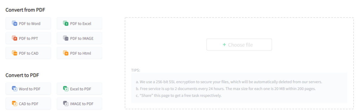 Можно конвертировать до двух документов в течение суток с максимальным объёмом файла 20 МБ и 200 страниц.