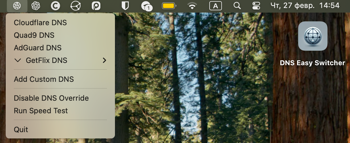 И решить мою проблему мне помогла утилита DNS Easy Switcher, которая из Строки меню позволяет быстро поменять параметры DNS на предустановленные: Cloudflare, Quad9, AdGuard или GetFlix.