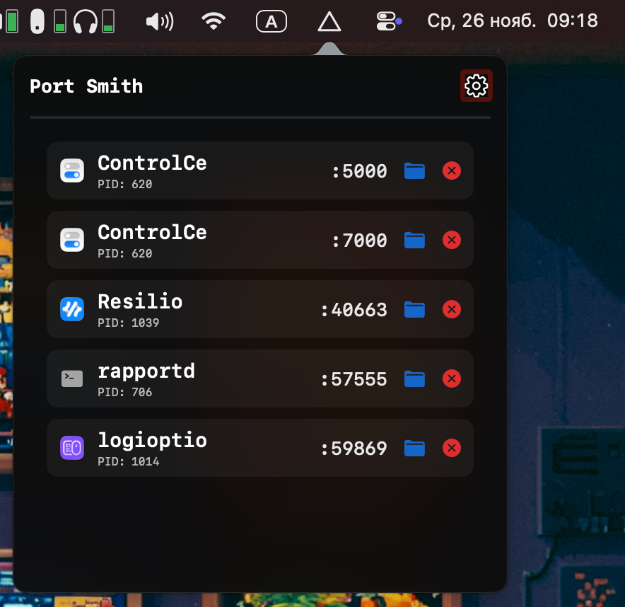 А можно установить бесплатное приложение Port Smith, которое из Строки меню сможет отображать список всех приложений и занятых портов. Отсюда же можно быстро закрыть проблемное соединение.