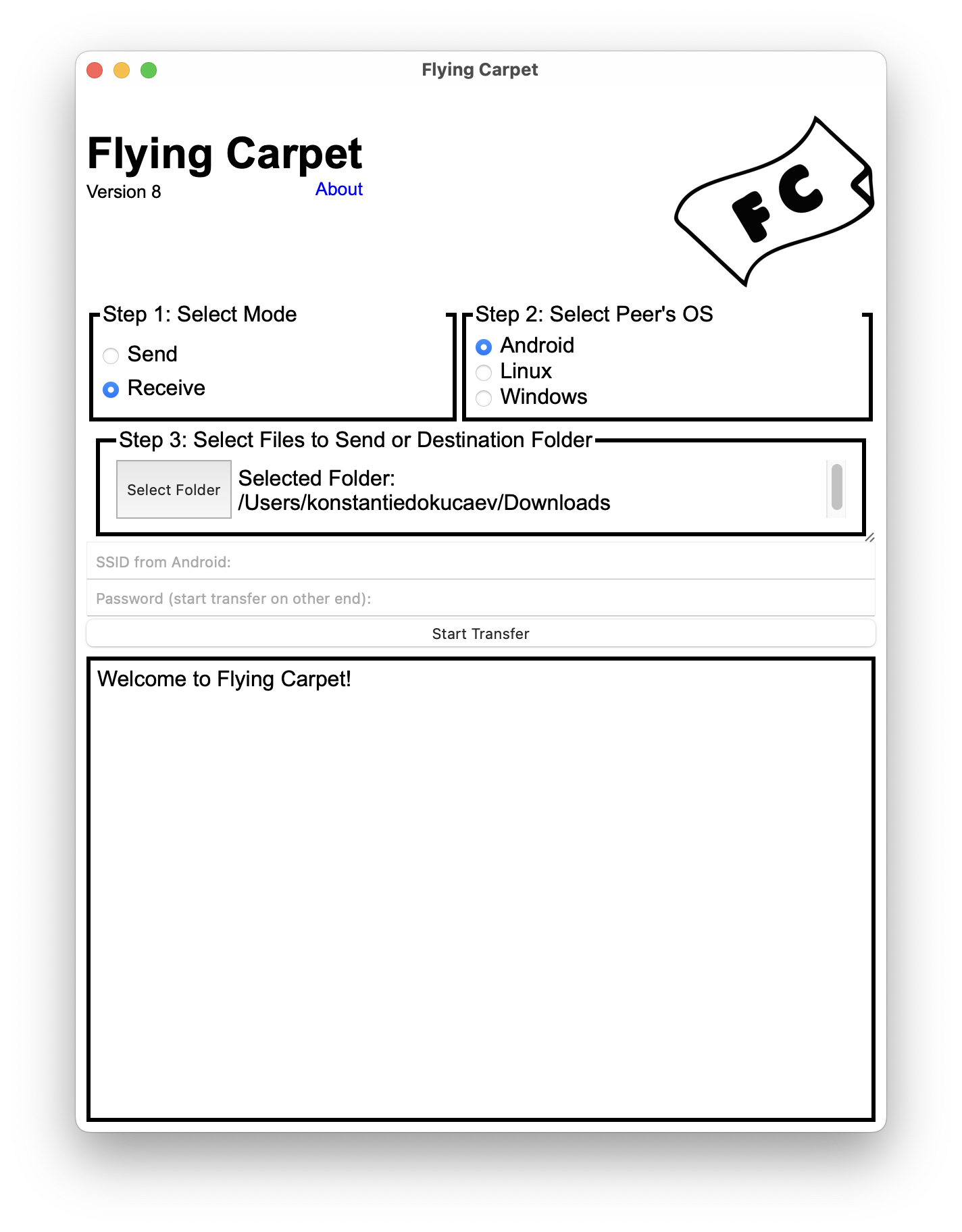 Независимо от используемой операционной системы при запуске Flying Carpet вы увидите окно, в котором нужно выбрать режим работы приложения: приём или отправка файлов. А также ОС второго устройства и папку приёма файлов.