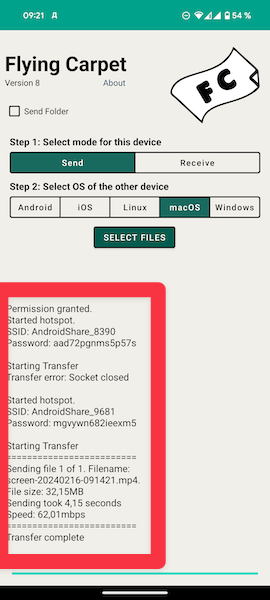 Эти данные нужно указать в приложении-приёмнике, и так же нажать Start Transfer. После чего устройство автоматически подключится к созданной точке, и начнётся передача файлов.