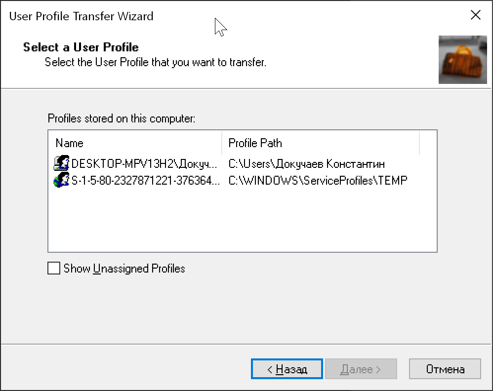 После выбора опции "I want to transfer data to another computer" нужно выбрать в списке профиль для переноса.