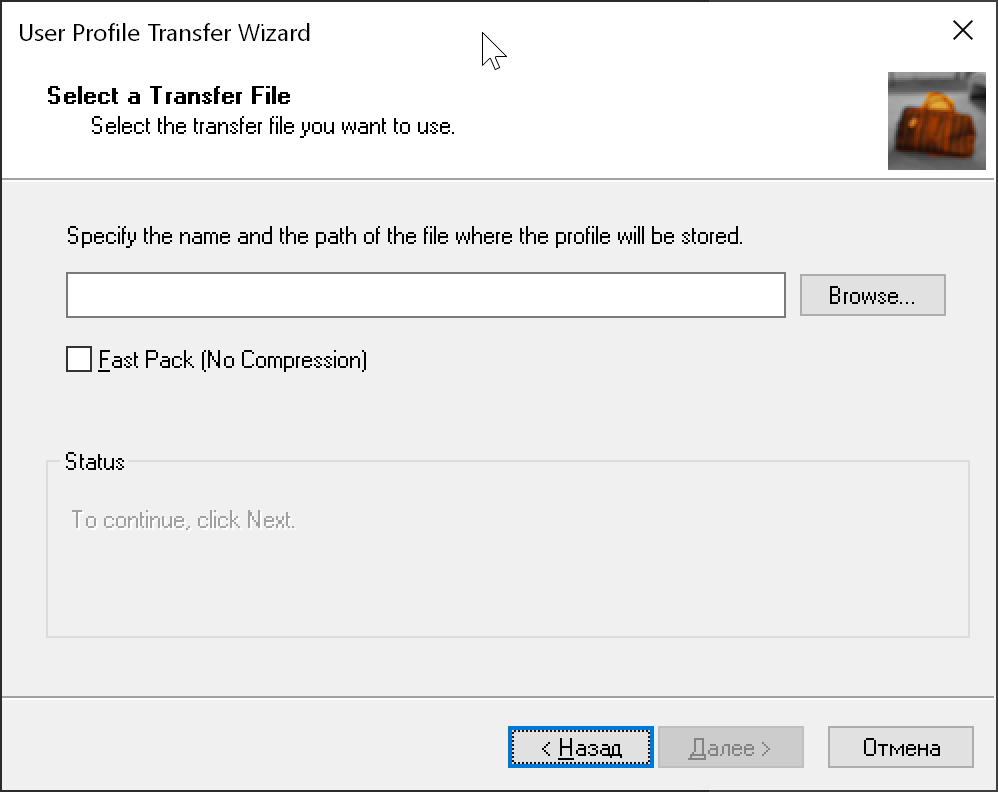 Для восстановления профиля на новом компьютере нужно нажать "I have data I want to transfer to this computer" и выбрать файл, созданный в предыдущем мастере.