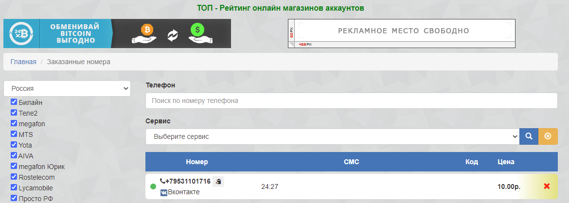 Сразу рекомендую пройти простую регистрацию и пополнить баланс. Аренда номера стоит около 10 рублей, а пополнить можно картой, электронными кошельками, криптой и многими другими способами.