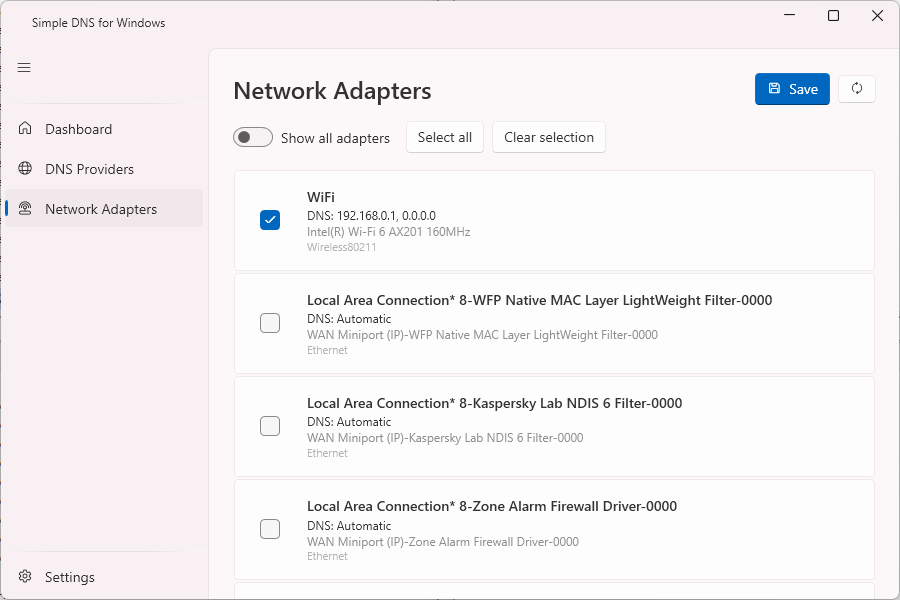 Ещё в Simple DNS for Windows есть раздел Network Adapters, но зачем он нужен — для меня осталось загадкой. Разве что посмотреть сводную информацию по сетевым адаптерам вашего ПК.