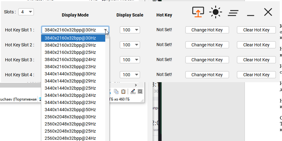 В настройках приложения вы можете назначить изменение разрешения, BPP, герцовки и масштабирования текста.