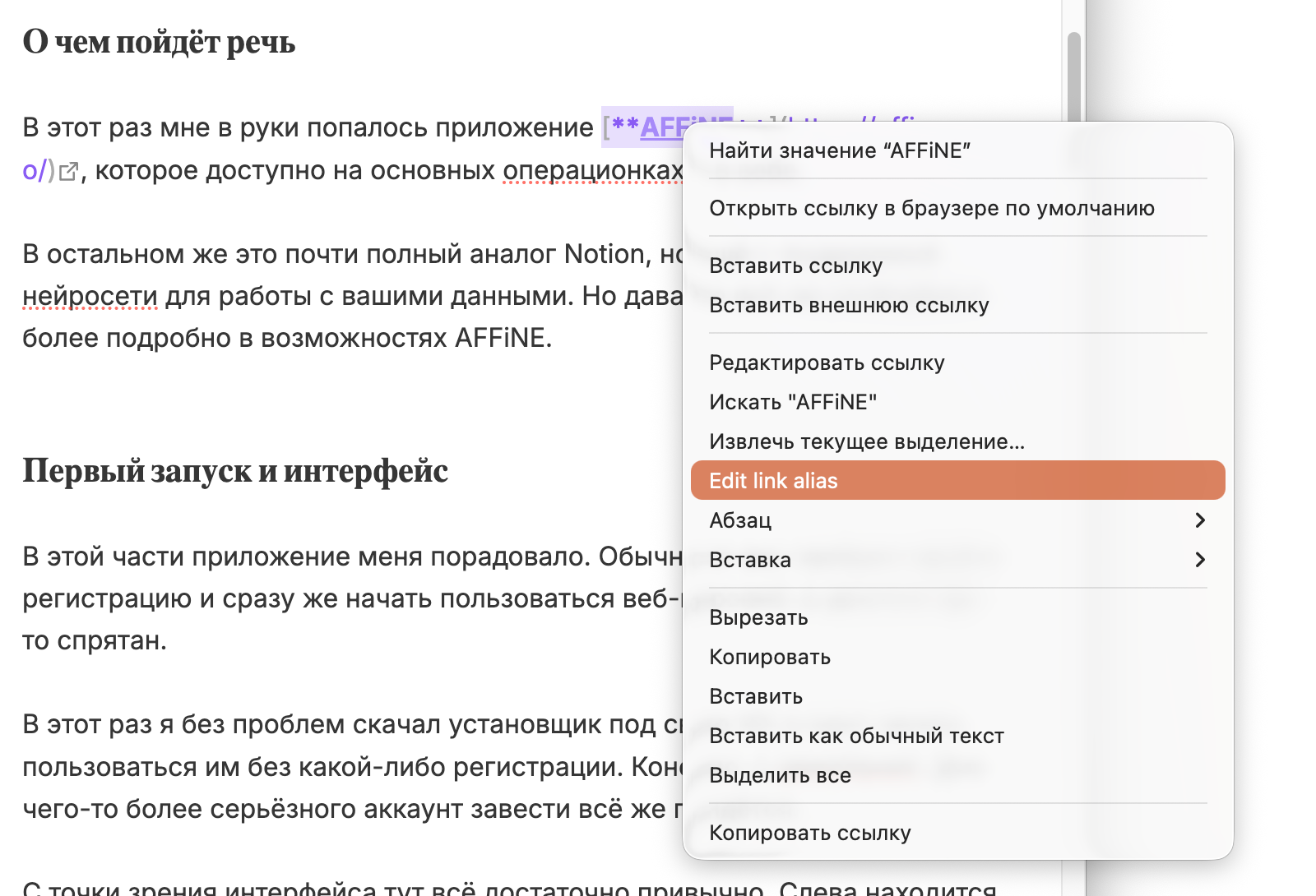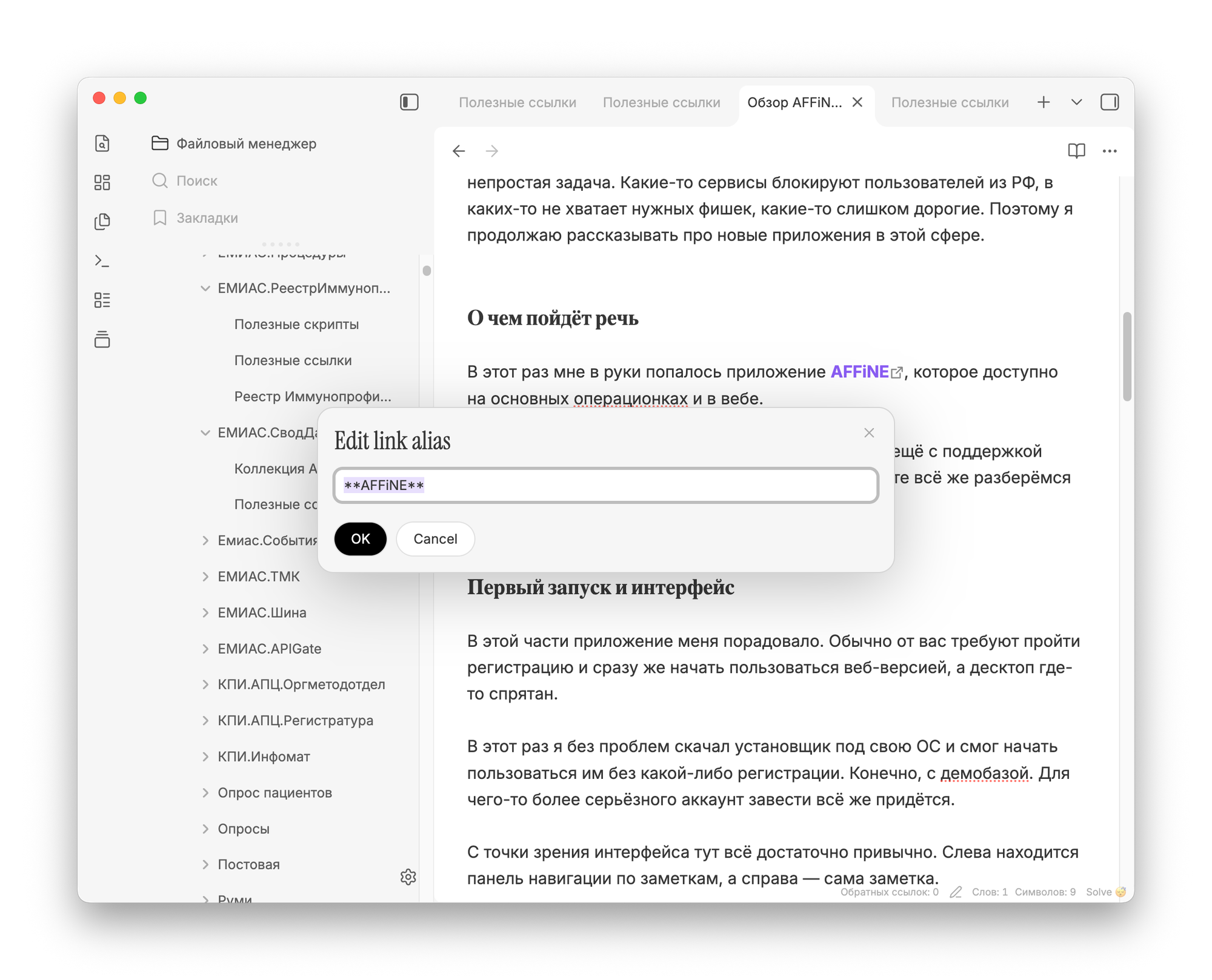 При нажатии на неё откроется отдельное окно, в котором можно указать новое значение Alias без необходимости редактирования самого текста заметки.
