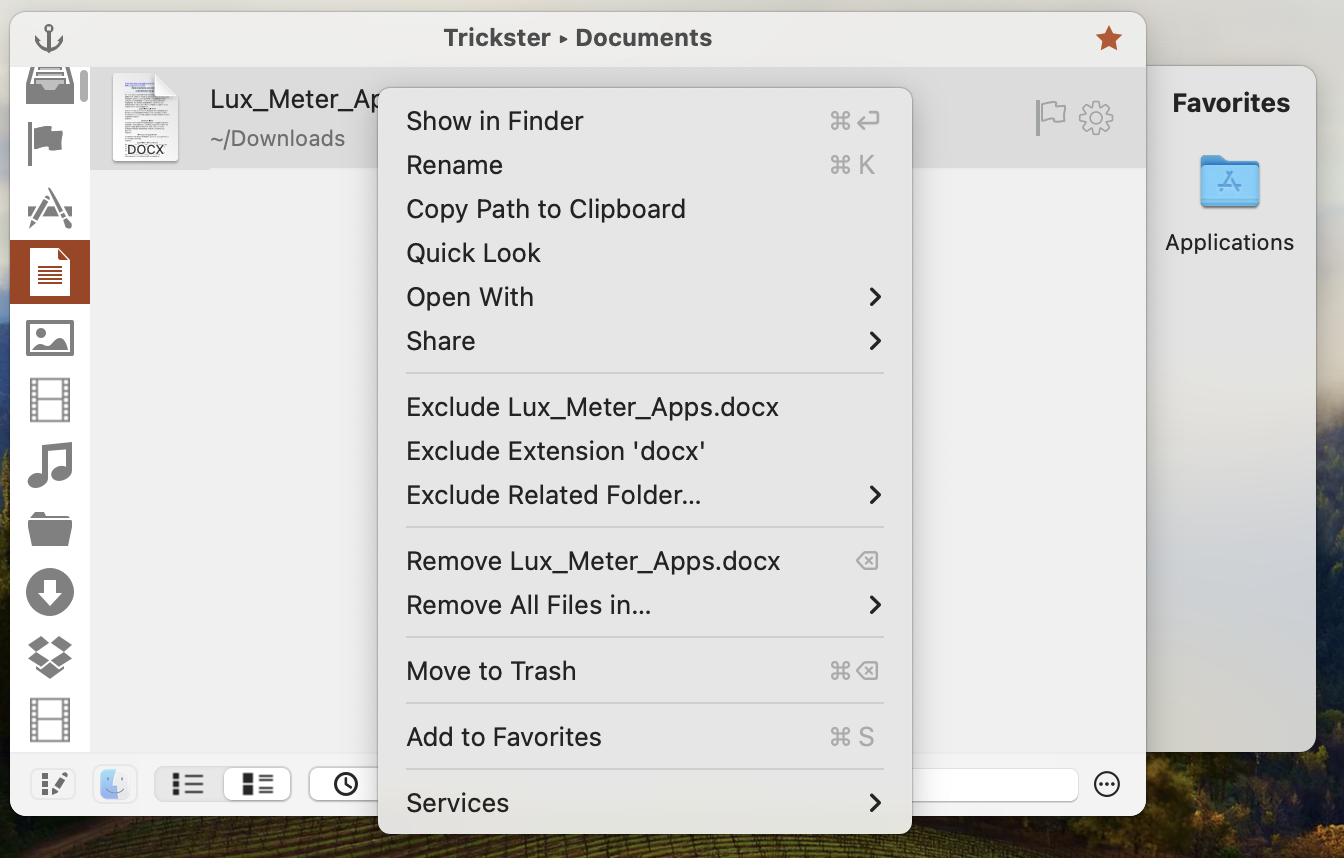 Работа с данными в Trickster ничем не отличается от Finder. Вы так же можете открыть или перенести файл, добавить его в избранное, поделиться и делать всё остальное, к чему вы так привыкли.