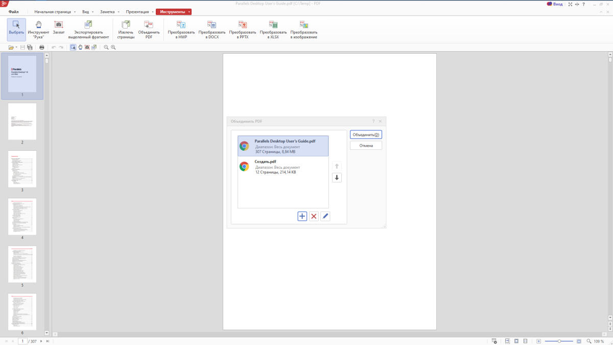 После чего нажать кнопку Объединить, и вы получите новый объединённый документ.