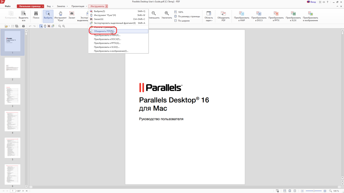 Аналогично предыдущей инструкции, работа начинается с открытия PDF и выбора пункта Инструменты > Объединить PDF.