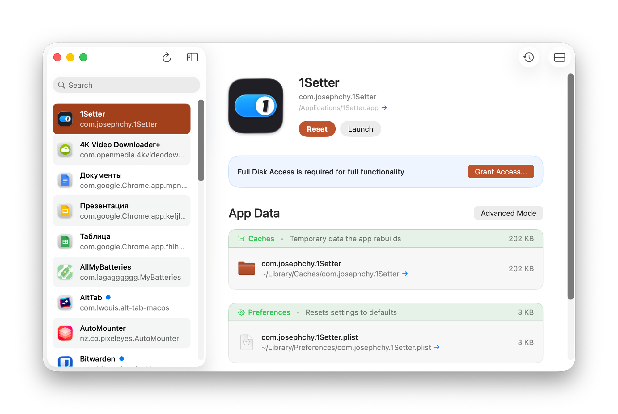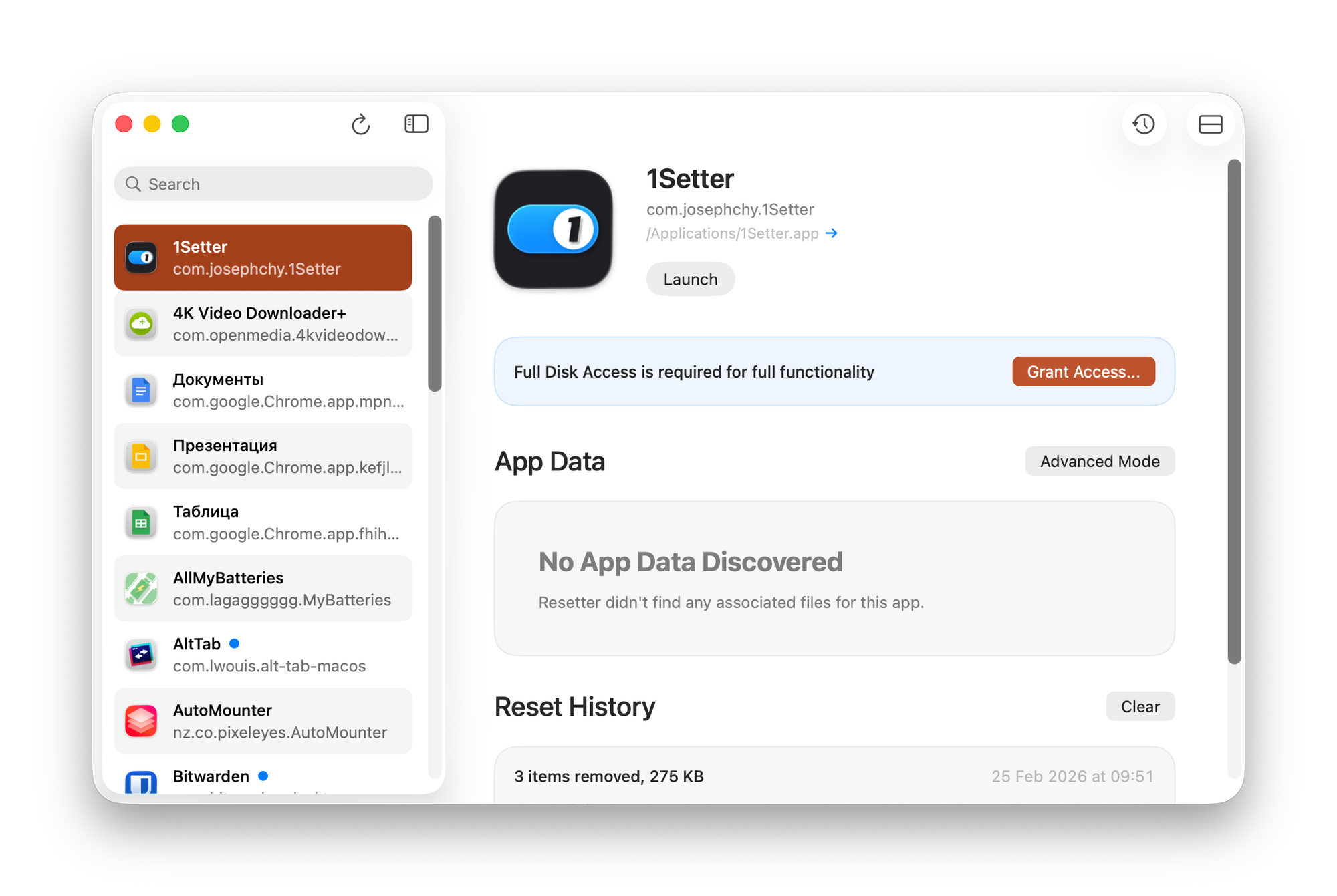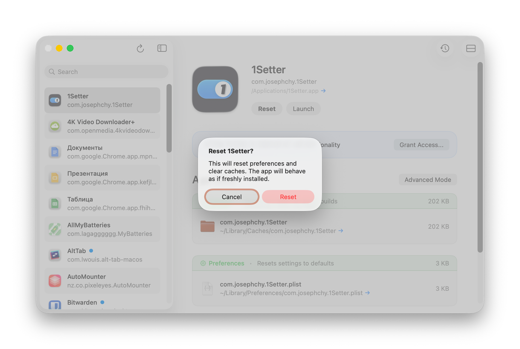 Для этого достаточно выбрать нужное приложение из списка и нажать кнопку Reset. После чего Resetter удалит все разрешения и кеш для выбранной программы.