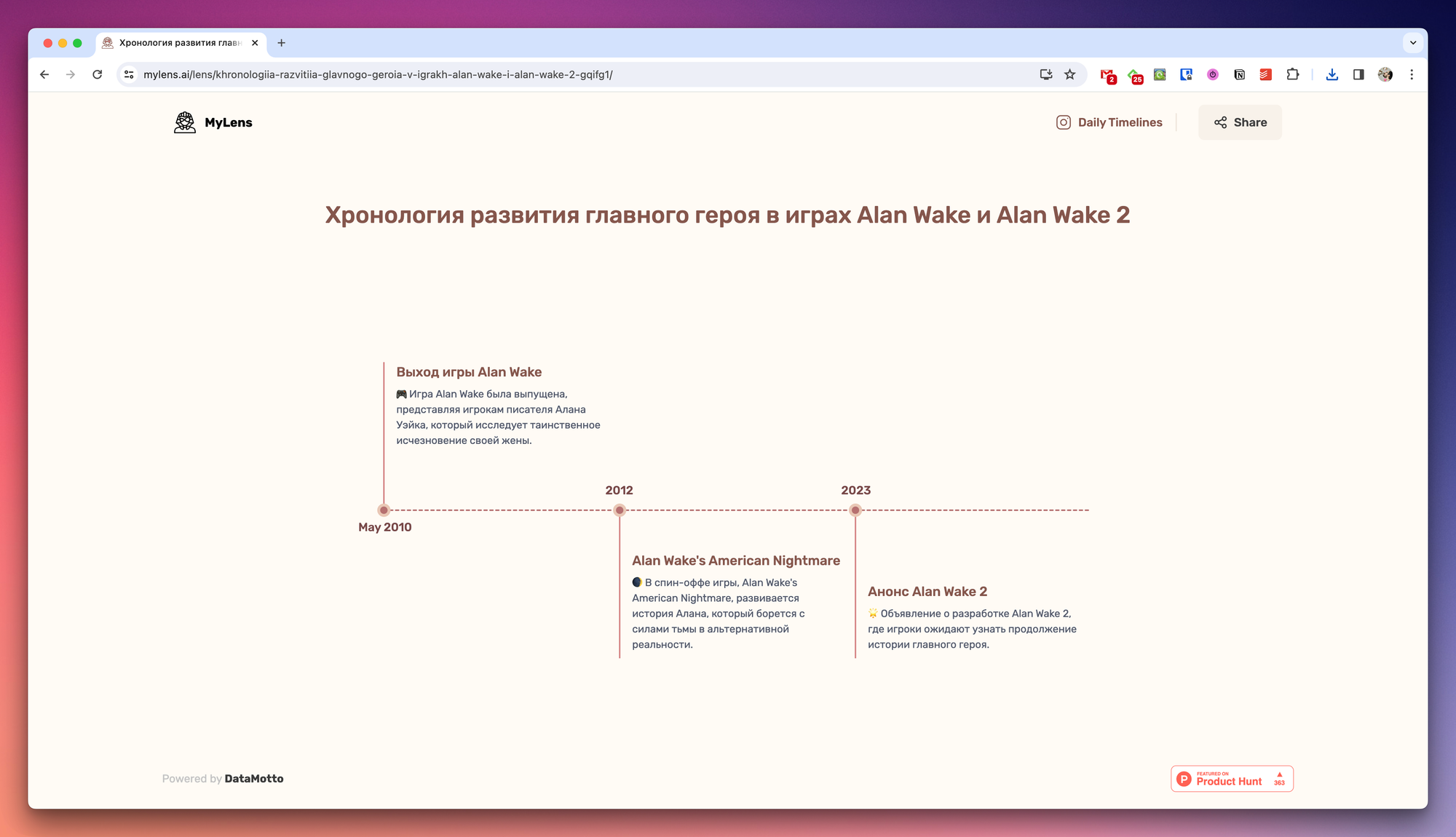 Например, MyLens, который поможет с помощью ИИ сгенерировать таймлайн по вашему запросу.