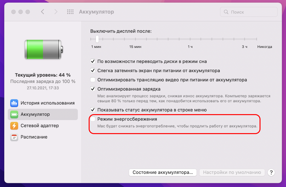 В macOS Monterey одним из нововведений является новый режим пониженного энергосбережения. Чтобы активировать его нужно выполнить несколько простых действий: перейти в параметры аккумулятора, выбрать раздел Аккумулятор или Сетевой адаптер.