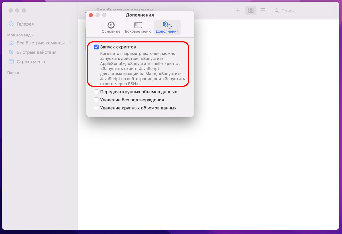 На втором шаге нужно перейти в настройки приложения Команды и там активировать Запуск скриптов.