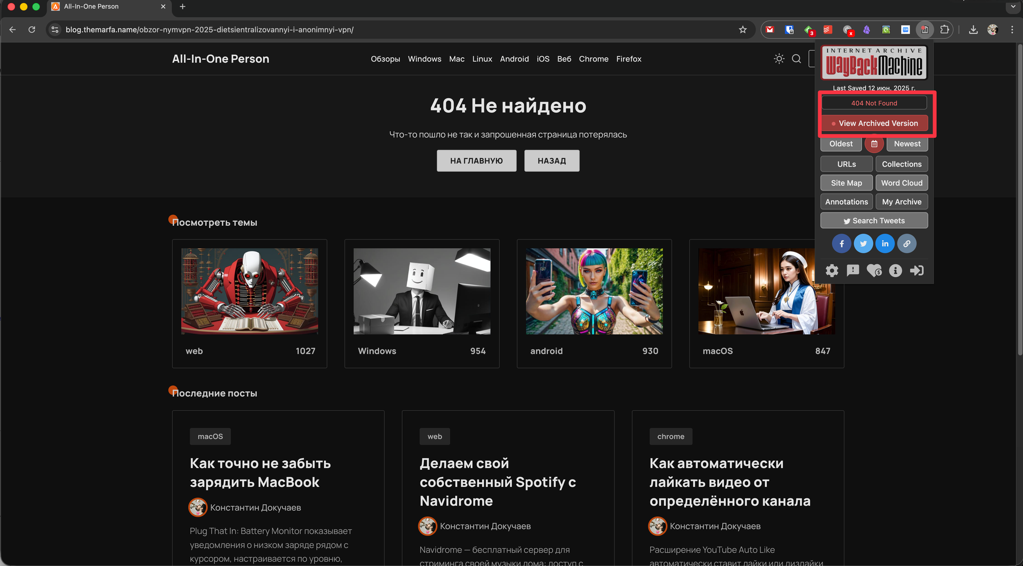 Иногда при переходе по какой-то ссылке вместо искомого текста отображается страница 404. Одним из самых простых способов получить доступ к удалённой странице является сервис Wayback Machine, который собирает и архивирует данные сайтов.