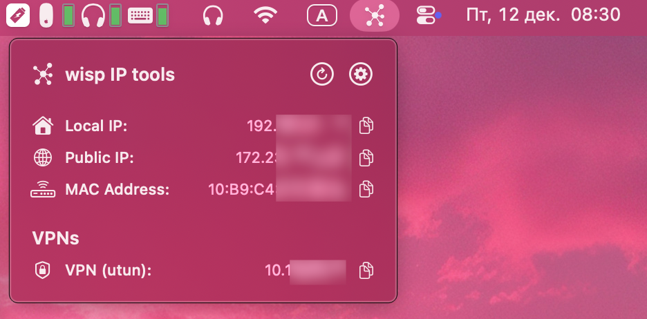 Приложение отображает локальный и внешний IP, Mac-адрес, а также IP вашего VPN-соединения.