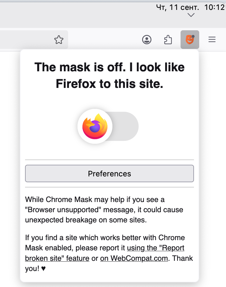 Сделать это можно несколькими способами, но самый простой — установка расширения Chrome Mask, которое по нажатию одной кнопки замаскирует Firefox под Chrome.