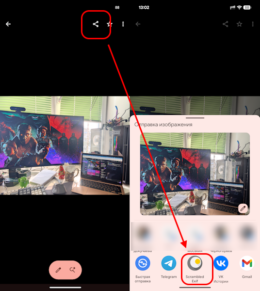 Чтобы удалить метаданные, нужно поделиться фото со Scrambled Exif. После чего выбор приложений для шаринга обновится ещё раз.