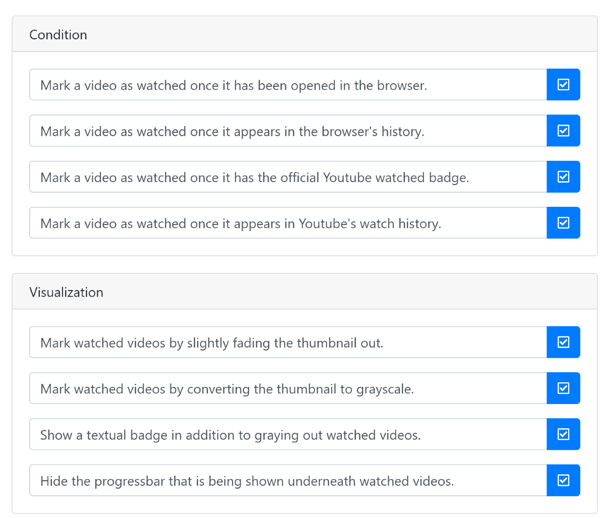 Также в настройках можно указать условия, при которых видео будет считаться просмотренным и стиль пометки о факте просмотра.