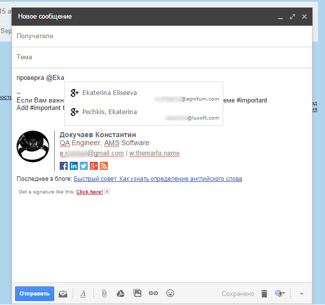При наборе письма, для включения подсказок, нужно поставить знак «@» или «+» и указать часть названия имени человека или файла: