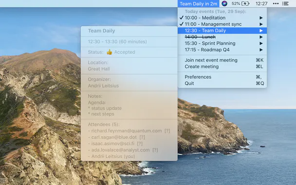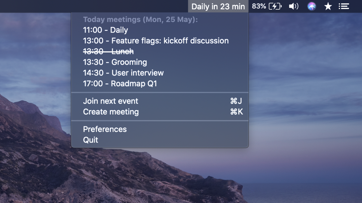 После установки MeetingBar вы можете добавить календари из более, чем 20 различных сервисов. А в баре будет отображаться время до ближайшего события. При клике по нему откроется полный список встреч. Добавить новую или перейти к текущему созвону можно простой комбинацией горячих клавиш.