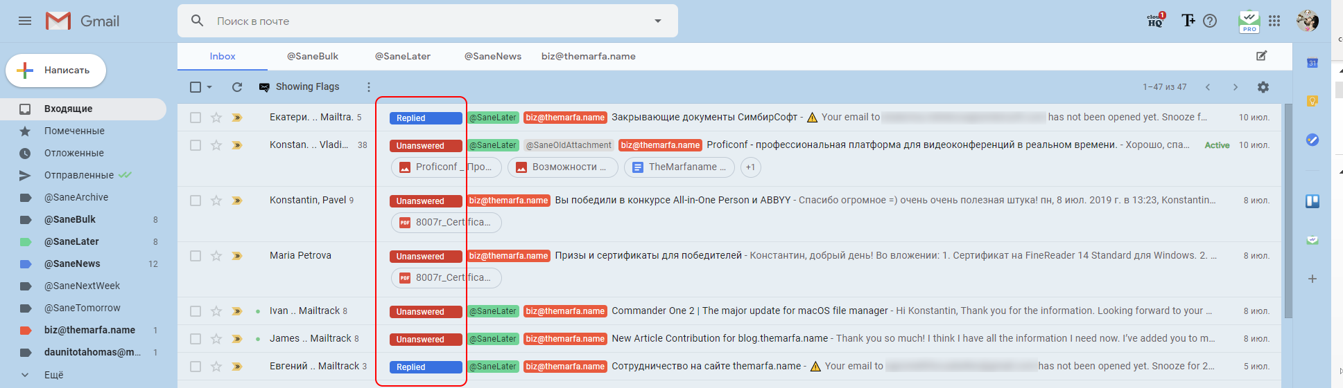 После установки расширения у всех писем автоматически начнут отображаться статусы Replied и Unanswered. Благодаря чему вы сможете быстро понять на какие письма стоит дать ответ.