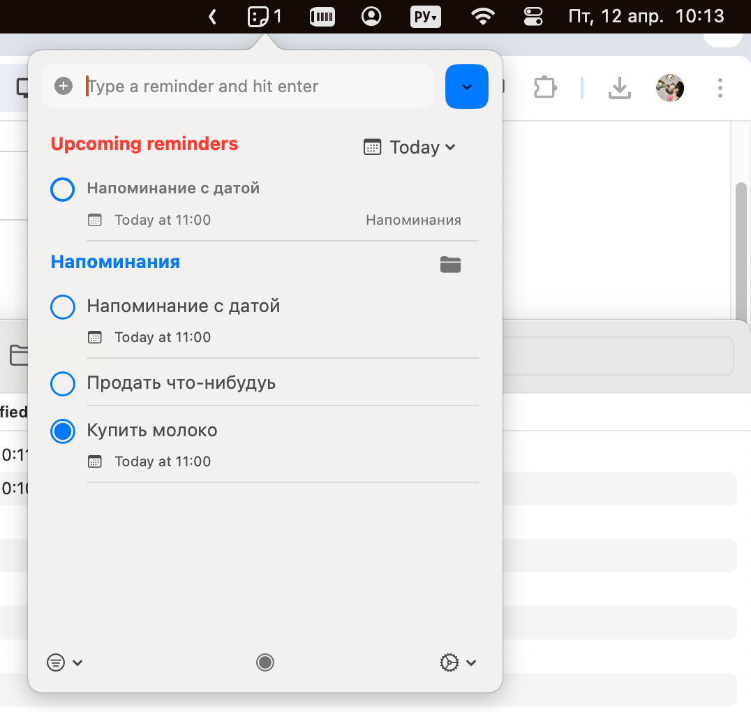Только вот в случае с десктопом работать с Напоминаниями не очень удобно. Чтобы их посмотреть или добавить новую запись, нужно открыть соответствующее приложение. Решить эту проблему можно с помощью бесплатного приложения Reminders MenuBar, которое добавляет возможность работы с Напоминаниями прямо из Строки меню.