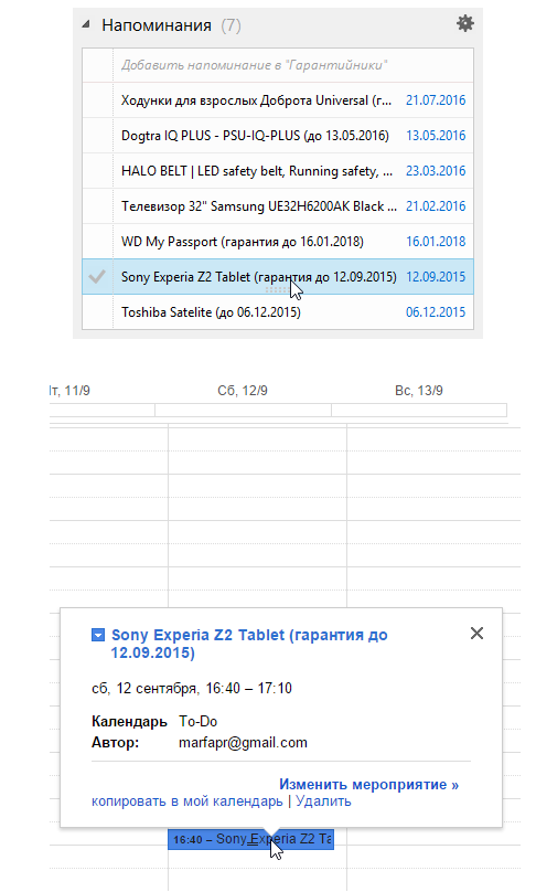 А вот так выглядит напоминание из Evernote в Google Calendar: