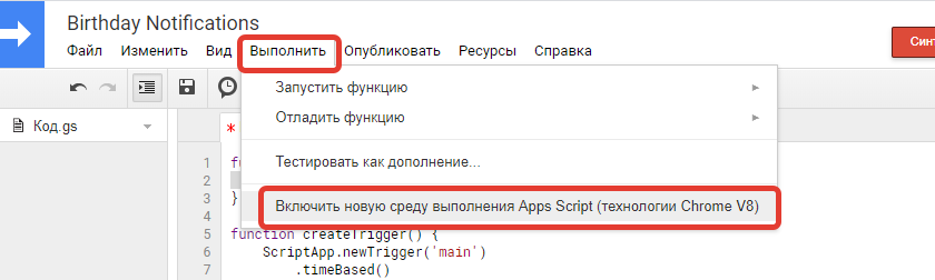 Закройте страницу «Диспетчера API» и на странице создания скрипта нажмите «OK» в окне дополнительных функций. Затем в меню «Выполнить» включите и разрешите доступ для «createTrigger: