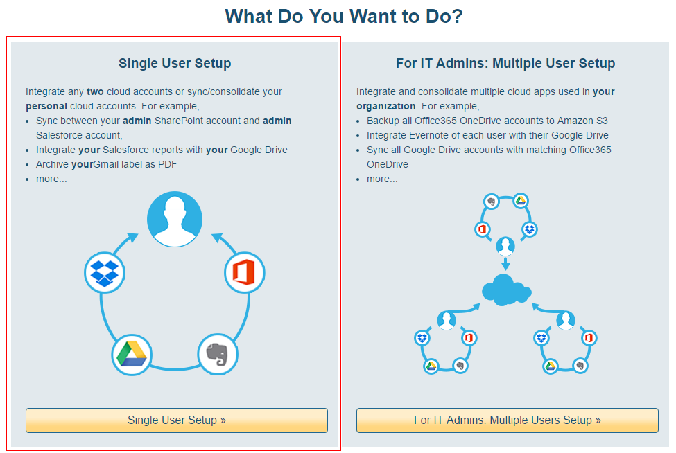 Для того чтобы подключить любое облачное хранилище к Evernote, нужно войти в свой аккаунт в cloudHQ и выбрать «Single User Setup»: