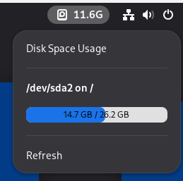 Пользователи Linux на оболочке Gnome 48 версии могут сделать это с помощью утилиты Free Space Indicator. Сразу после её установки вы увидите свободный объём дисков, а при нажатии на иконку — всю информацию о пространстве.