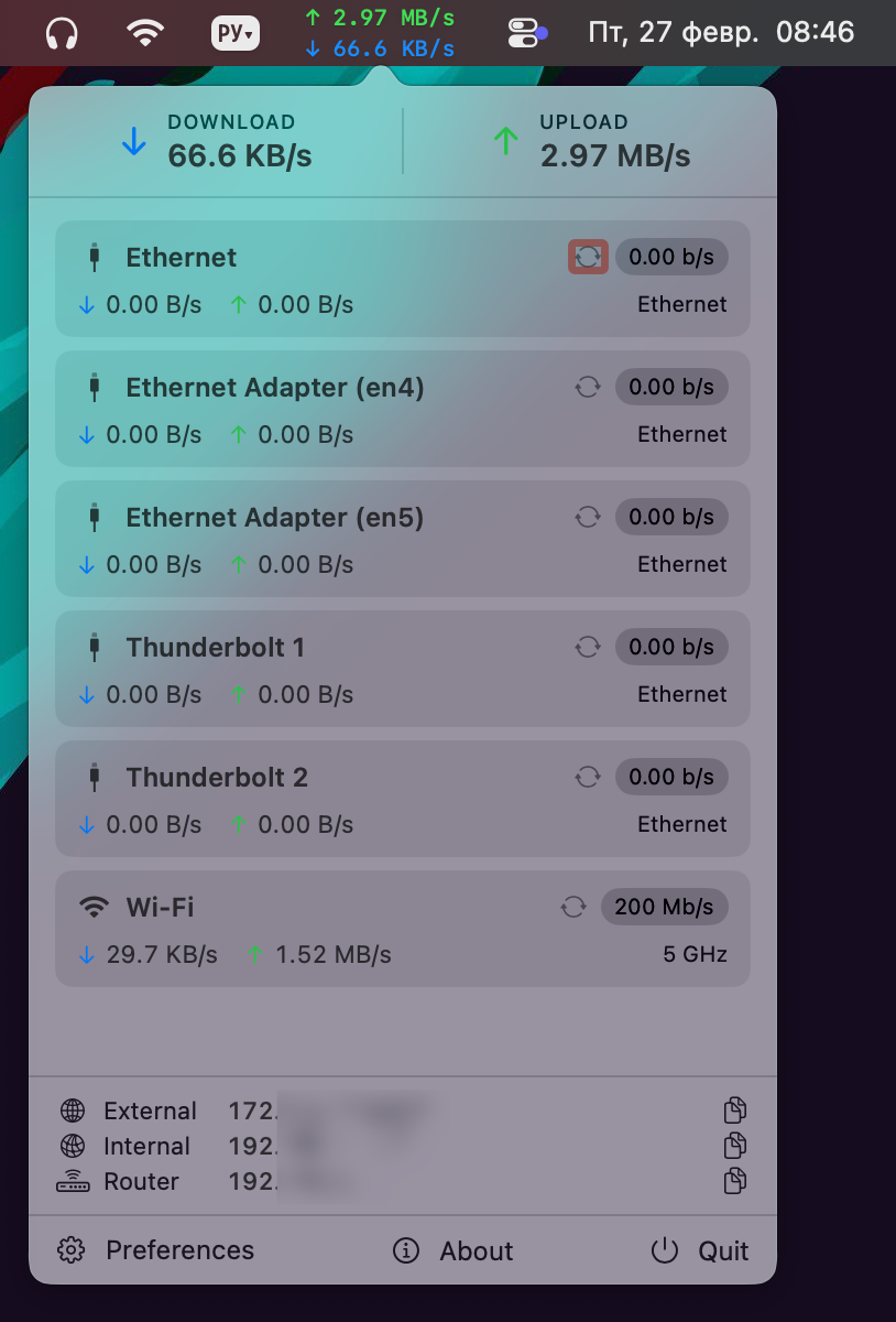 При клике на неё вы сможете увидеть более подробные данные по всем активным сетевым интерфейсам. Здесь кроме скорости можно увидеть и скопировать IP-адрес нужного интерфейса.