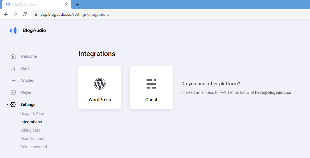 Для подключения движка к сайту нужно перейти в раздел Integrations и выбрать WordPress или Ghost и далее выполнить простые инструкции.
